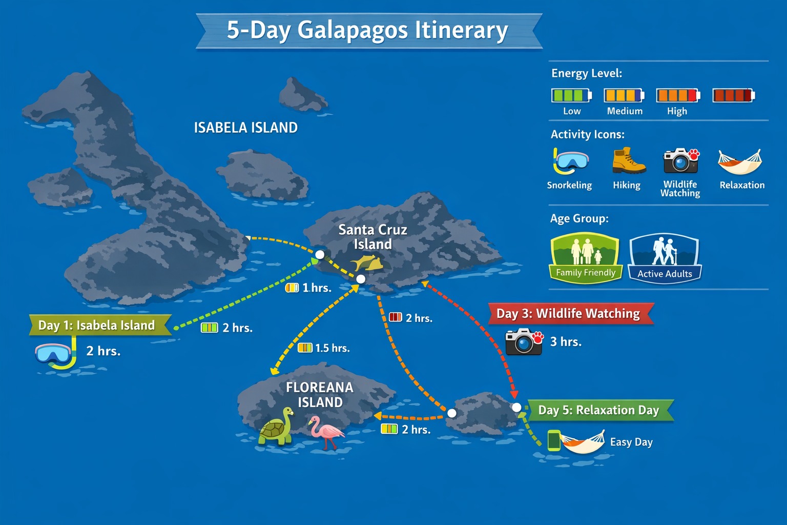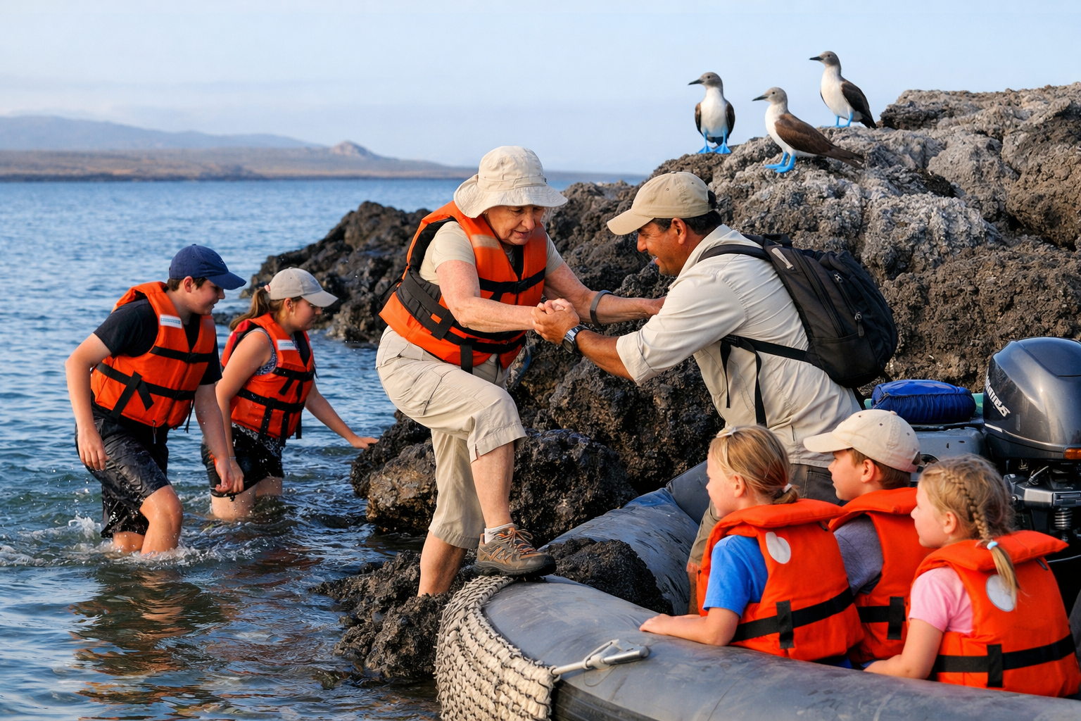 Start with Santa Cruz or San Cristobal as your hub. If staying for more thant 5 days Add Isabela for active exploration and Floreana for quiet wildlife watching. Keep transfers under 2 hours. Plan one major activity per day with optional add-ons for energetic members. Choose land-based accommodations that let different generations operate on different schedules.